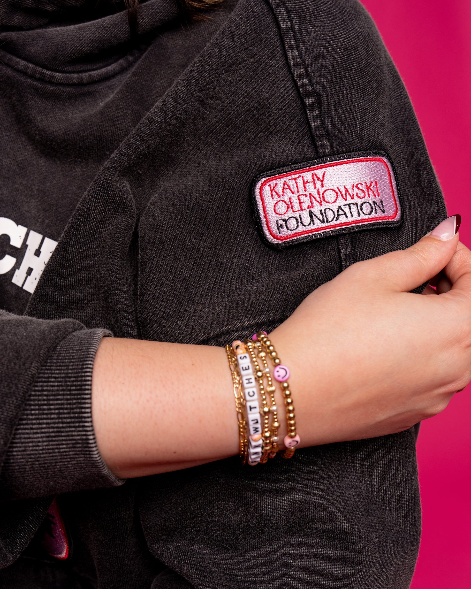 With its one-of-a-kind look and cozy vibe, this hoodie is perfect for layering up at Pink Witches Night Out – whether you're showing support, honoring survivors, or simply standing together for a powerful cause. The relaxed fit and unique patchwork details make it effortlessly stylish, while the soft, lived-in feel brings comfort that lasts all night.