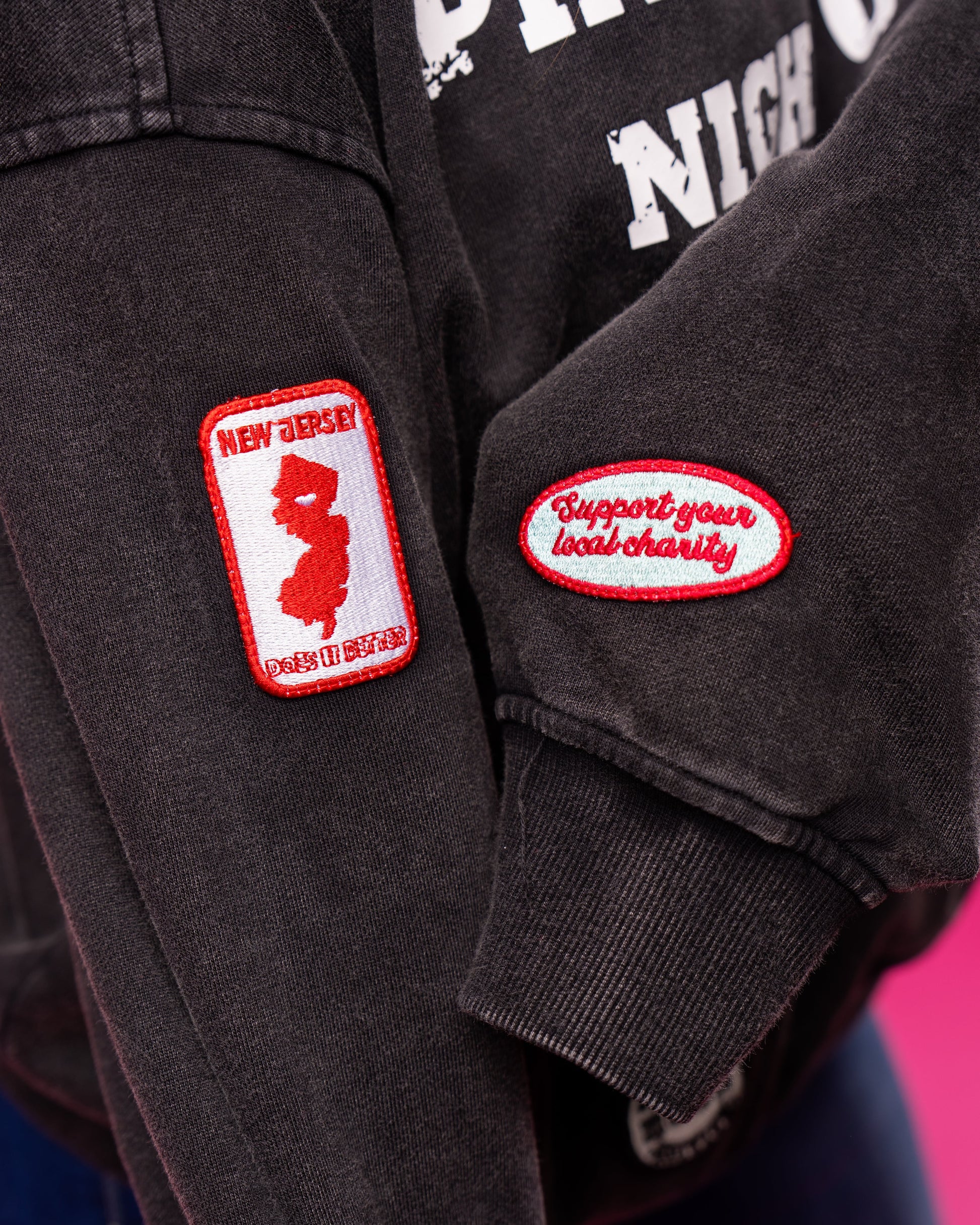 Patches include: Classic Pink Witches Logo, Limited 2025 Edition Patch, Kathy Olenowski Foundation Patch, Support Your Local Charity Patch, and New Jersey Does it Better Patch.